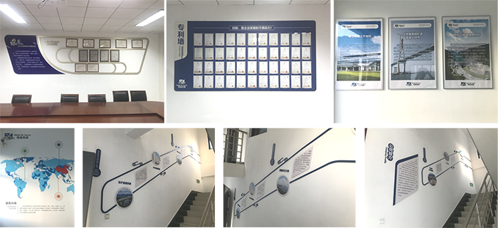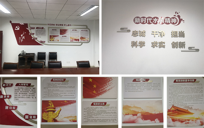 (围绕“不忘初心,牢记使命”主题,布置入党誓词、党员权利、党员义务、党的宗旨、党支部基本任务和新时代水利精神的党建主题墙。) (公司产品应用和创新成果展示,彰显公司高新技术企业的特点与实力,营造创新驱动、科学发展、开拓进取的工作氛围。)