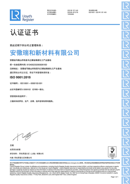 2021年1月14日,安徽瑞和新材料有限公司获得劳氏质量认证(上海)有限公司颁发的ISO9001质量管理体系认证证书,认证范围为工程材料的开发、生产、应用、技术咨询和现场服务。 2021年1月5日~8日,劳氏审核专家组对公司综合办公室、安环工程部、设备部、生产部、工程技术中心进行了全过程、全条款覆盖式现场审核,经过专家全面、严格、细致的指导和审核,确认公司质量管理体系符合ISO 9001:2015质量体系标准的要求,通过现场认证。 ISO9001质量管理体系认证的取得,标志着瑞和公司已步入规范化、标准化、科学化的现代企业管理轨道。瑞和公司将在今后的工作中严格执行质量管理体系及规章制度,进一步优化和规范各项管理制度,不断提高管理水平,持续提升产品质量,更好地为客户提供优质的产品和服务!